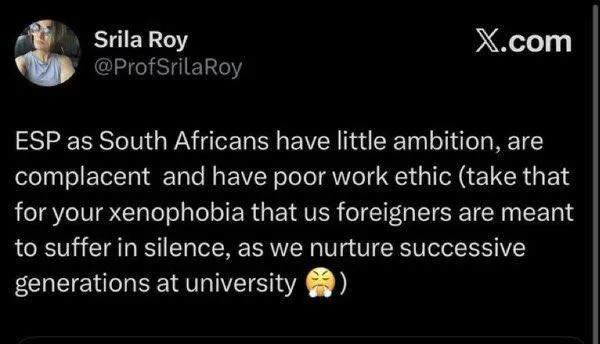 Professor Srilata Roy has sparked outrage for allegedly referring to South Africans as lazy.