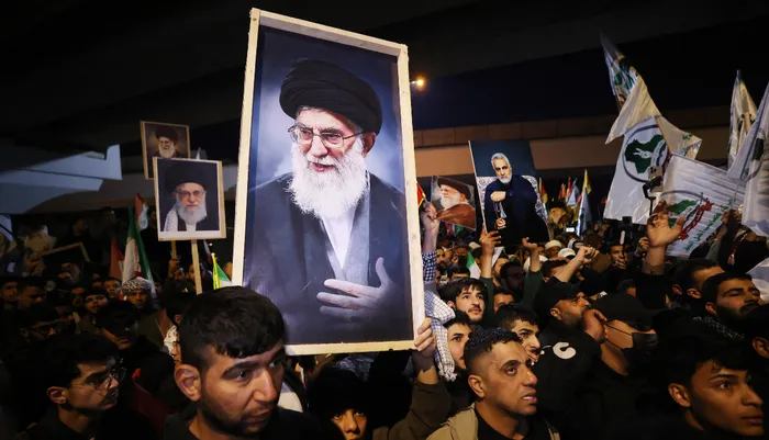 Iraqi Shiites carry a portrait of Iran's Supreme Leader Ayatollah Ali Khamenei during a protest against US and Israeli attacks on Iran at a bridge leading to Green Zone where the US embassy is located, in Baghdad, Iraq on Saturday.