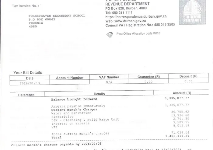 Foresthaven Secondary School in Phoenix is struggling with a R1.4 million municipal utility bill, prompting calls for a moratorium on disconnections.