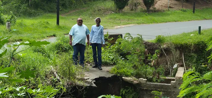 Highridge residents, Dev Nundall, left, and Ashe Sukdev, show the damaged bridge.