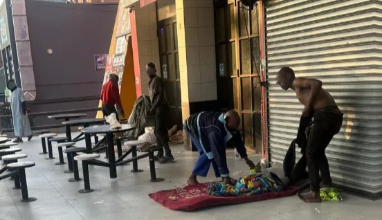 A homeless man, on the right, gets ready for work as car guards. His car guard vest is next to his make-shift bed.
