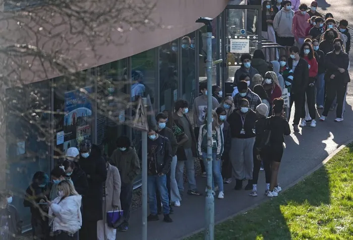 Students wearing face masks queue up to get vaccinated at the University of Kent in Canterbury, south-east England.