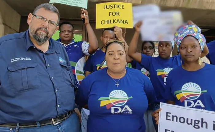 Members of the Democratic Alliance held a protest outside the Pretoria Magistrate's Court, calling for justice and that bail be denied. Seen, in the front, are councillors, Leon Kruyshaar, Novina Pillay and Phuti Kwenaite.
