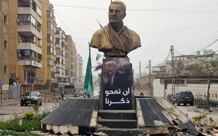 A sign depicting US President Donald Trump, with the caption "you will not erase our memory" in Arabic, is displayed before a memorial depicting Qassem Soleimani, the slain commander of the "Quds Force" of Iran's Islamic Revolutionary Guards Corps (IRGC) who was killed by a US airstrike in 2020, along the road leading to Beirut International Airport in Beirut on April 4, 2026. Lebanon was drawn into the Middle East war on March 2 when Hezbollah launched attacks on Israel to avenge the killing of the Iranian leader. Israel has responded with broad strikes across Lebanon and a ground offensive.