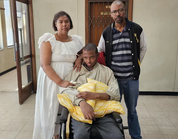 Joshua Petersen stands with his parents, Bernadette and Trevor, outside the courtroom at the Durban Regional Court, united in their grief and anger after the lenient five-year sentence for the boy who left him paralysed.
