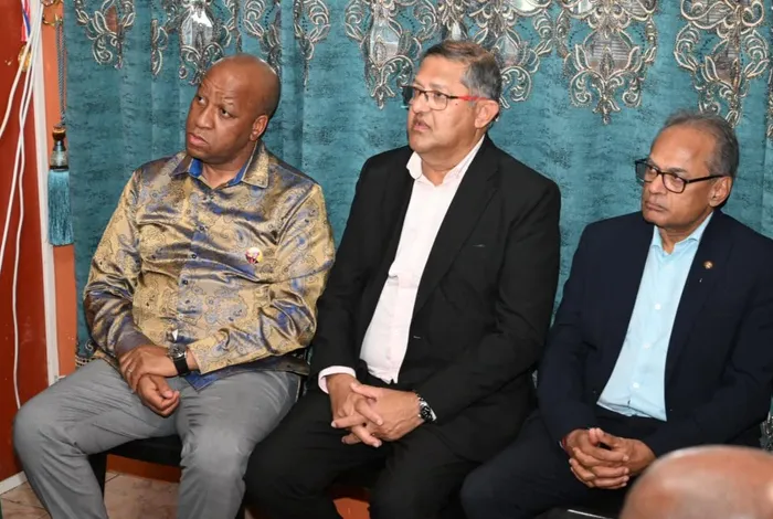 Premier Thamsanqa Ntuli, from left, Narend Singh (Deputy Minister of Forestry, Fisheries and the Environment) and Poobalan “Les” Govender (deputy chairperson of the National Council of Province).
