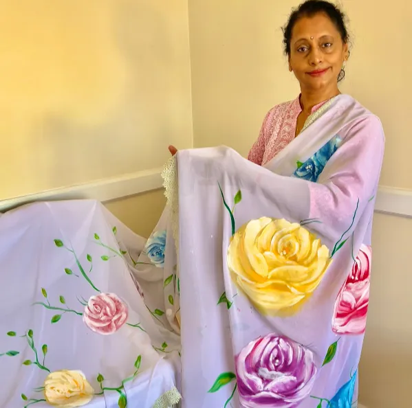 “I started experimenting with shawls and then saris, simply allowing creativity to guide me. To my surprise, each piece came to life beautifully, exceeding my own expectations. Equally important was ensuring durability. I tested each design through multiple washes to ensure the artwork retained its integrity and vibrancy.