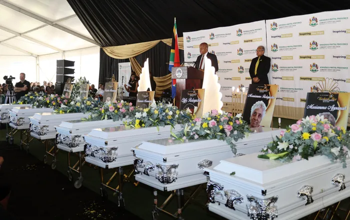 The mass funeral of the Newark family – Alan and Sandy Monswamy, their children Kraidon and Shamarie, and relatives Cliffy Padayachee, Mooniamma Padayachee and Mariamma Appanah – was held on Sunday at the Stanger High School sports ground. The family were allegedly kidnapped from their home last week, and their bodies were found in Melmoth. Premier Thamsanqa Ntuli, of KwaZulu-Natal, delivered this speech at the funeral, which was paid for by the provincial government.