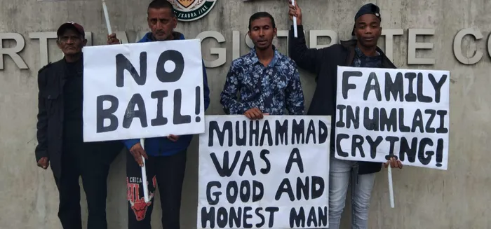Family members and friends of the victims Mahmudel Sajid and Mzikayise Paulos Mabida protested outside court. From left: Paul Deepchand Harilal, Vishnu Gengan, Yasseen Yusuf, and Patrick van Schalwyk.