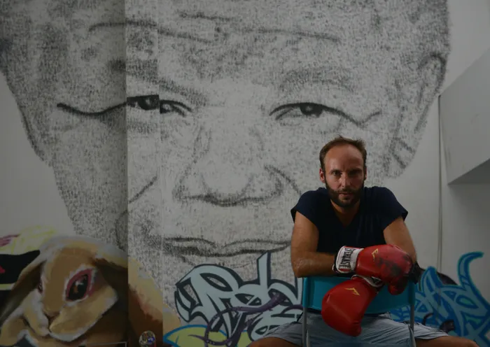 Shanghai-based Belgian artist Phil Akashi sits in front of his portrait of Nelson Mandela, which he forged by pounding the wall 27 000 times with a boxing glove bearing the Chinese character for "freedom". Shanghai-based Belgian artist Phil Akashi sits in front of his portrait of Nelson Mandela, which he forged by pounding the wall 27 000 times with a boxing glove bearing the Chinese character for "freedom".