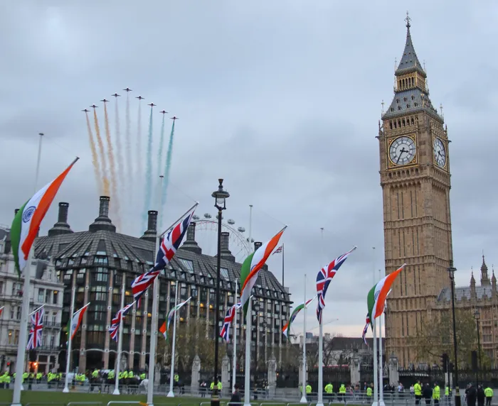 A handout image made available by the British Ministry of Defense showing The Royal Air Force Aerobatic Team, the Red Arrows flying past London landmark Big Ben (R) as they fly over central London to mark the visit by the Prime Minister of India, Shri Narendra Modi, with a flypast over Parliament Square, London, Britain, 12 November 2015. EPA/SAC ADAM FLETCHER /CROWN COPYRIGHT