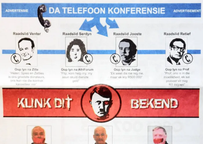 In a conversation with Premier Helen Zille, a councillor says the municipality could not cancel contracts with two residents who were the DA’s biggest donors. The poster also carries accusations of corruption and defaulting on tax by the municipality.