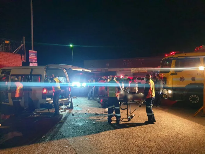 A WOMAN was killed and 14 others injured when a minibus taxi crashed into a brick wall. Picture: Emer-G-Med