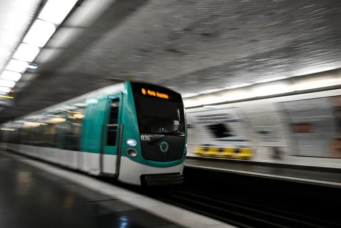 This photograph shows a subway train entering a metro station in Paris on April 1, 2024.