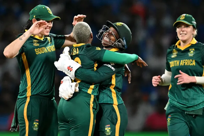 outh Africa's Nonkululeko Mlaba celebrates with teammates after taking the wicket of India's captain Harmanpreet Kaur during the ICC Women's Cricket World Cup 2025 one-day international (ODI) final match between India and South Africa at the DY Patil Stadium in Navi Mumbai