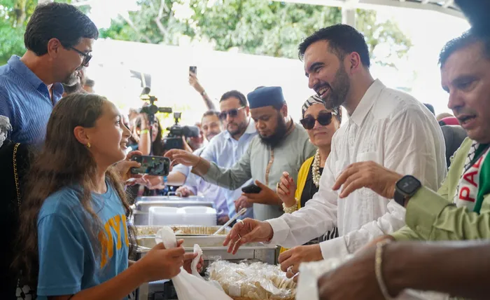 New York City Mayor elect Zohran Mamdani helps handing out lunch after he joined members of the Centro Islamico del Caribe-Masjid Ebadur Rahman mosque in prayer in San Juan, Puerto Rico.