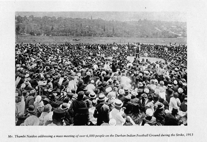 Thambi Naidoo addressing a mass meeting of over 6 000 people on the Durban Indian Football Ground during the Strike, 1913.