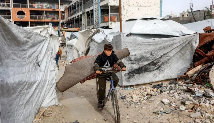 A BOY rides a bicycle loaded with carpets and mats past tent shelters at a makeshift camp for people displaced by conflict in Al-Rimal school run by the United Nations Relief and Works Agency for Palestine Refugees in the northern Gaza Strip.