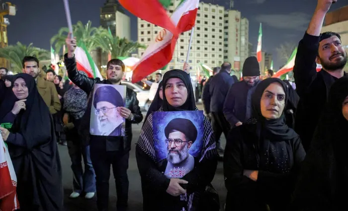 Mourners hold pictures of Iran’s supreme leader Ali Khamenei at a memorial vigil, a day after his assassination in joint US and Israeli strikes, in Tehran, on Sunday.