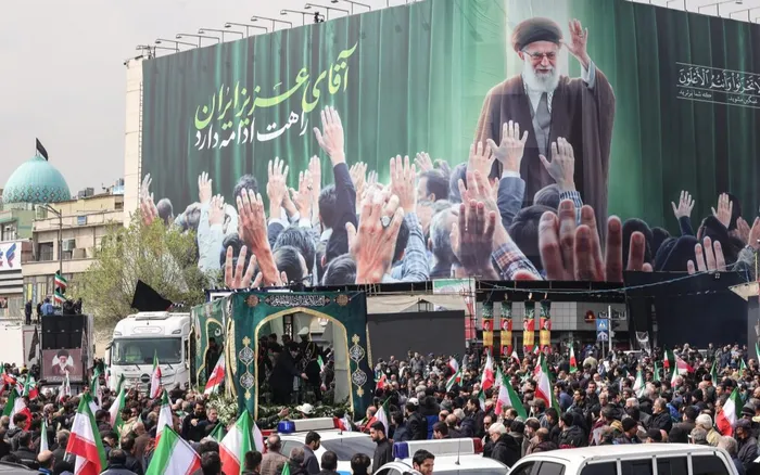 Iranians gather beside a billboard depicting Iran’s slain supreme leader Ayatollah Ali Khamenei as they attend the funerals of Iran's Revolutionary Guards Corps (IRGC) commanders, army commanders and others killed in the early days of the United States and Israeli strikes on Iran, at Enghelab Square in Tehran today.