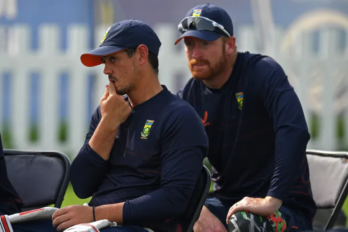 South Africa's Quinton De Kock (L) and his teammate Wiaan Mulder attend a practice session ahead of the ICC men's Twenty20 World Cup cricket match against the West Indies. Photo: Indranil Mukherjee/AFP