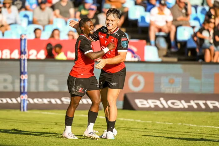 Two Lions rugby players celebrate after scoring a try Emirates Lions fullback Quan Horn (right) was awarded the United Rugby Championship’s Iron Man Award on Tuesday. Picture: Steve Haag Sports/INPHO/Shutterstock/BackpagePix