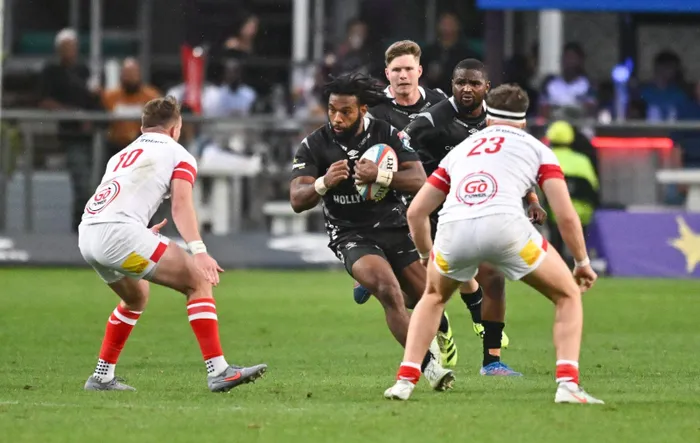 Sharks centre Jurenzo Julius runs at the Ulster defence during their United Rugby Championship match.
