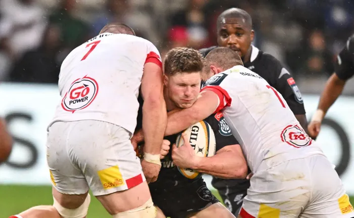 Nick Timoney of Ulster Rugby and Jacob Stockdale of Ulster Rugby has Ethan Hooker of Hollywoodbets Sharks wrapped up during United Rugby Championship at Kings Park in Durban. | BackpagePix