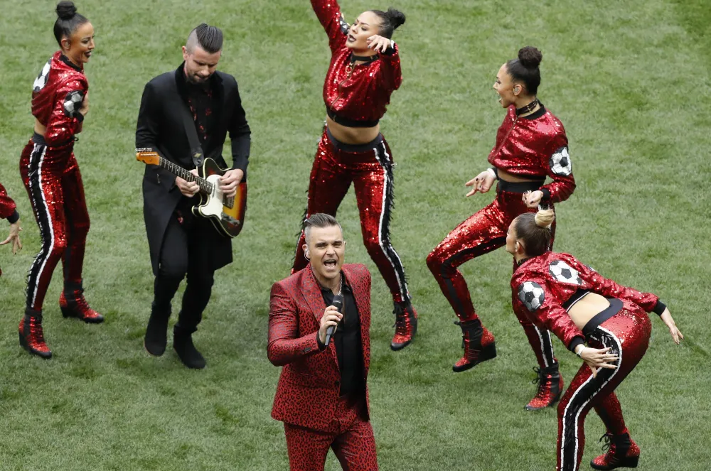 Williams also performed his hits “Let Me Entertain You” and “Feel” in Thursday’s ceremony before the Russian and Saudi Arabian teams entered the pitch for the first of 64 matches.