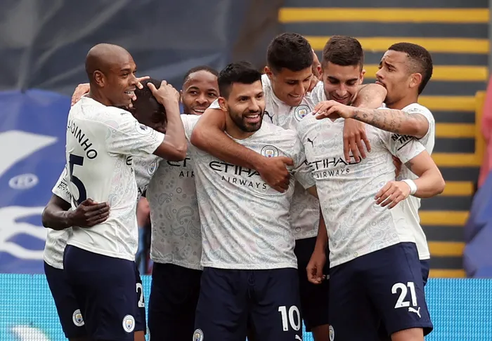 Manchester City's Sergio Aguero celebrates with teammates after scoring their first goal in their Premier League game against Crystal Palace at Selhurst Park on Saturday. Photo: Clive Rose/Reuters