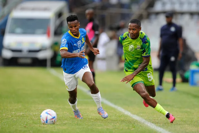 Themba Zwane of Mamelodi Sundowns and Sibusiso Sibeko of Marumo Gallants FC fight for the ball during their Nedbank Cup match at the Free State Stadium in Bloemfontein on Thursday Themba Zwane of Mamelodi Sundowns and Sibusiso Sibeko of Marumo Gallants FC fight for the ball during their Nedbank Cup match at the Free State Stadium in Bloemfontein on Thursday. Photo: Charle Lombard/BackpagePix