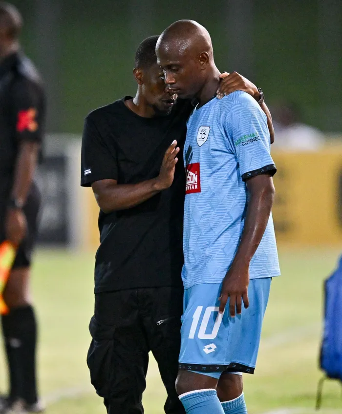 Sinethemba Badela, head coach of Durban City FC chats to Samkelo Maseko during their 1-0 Betway Premiership win against Polokwane City at the Chatsworth Stadium on Sunday.