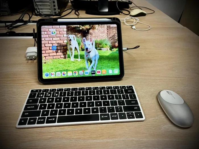 Using Apple’s cheapest iPad A16 with a Bluetooth keyboard and mouse for a full workday revealed its impressive screen clarity and decent performance, though memory limitations and app optimisation issues posed challenges, making it a viable but slower alternative to a laptop, especially for those prioritising portability. Picture: Michael Sherman/IOL